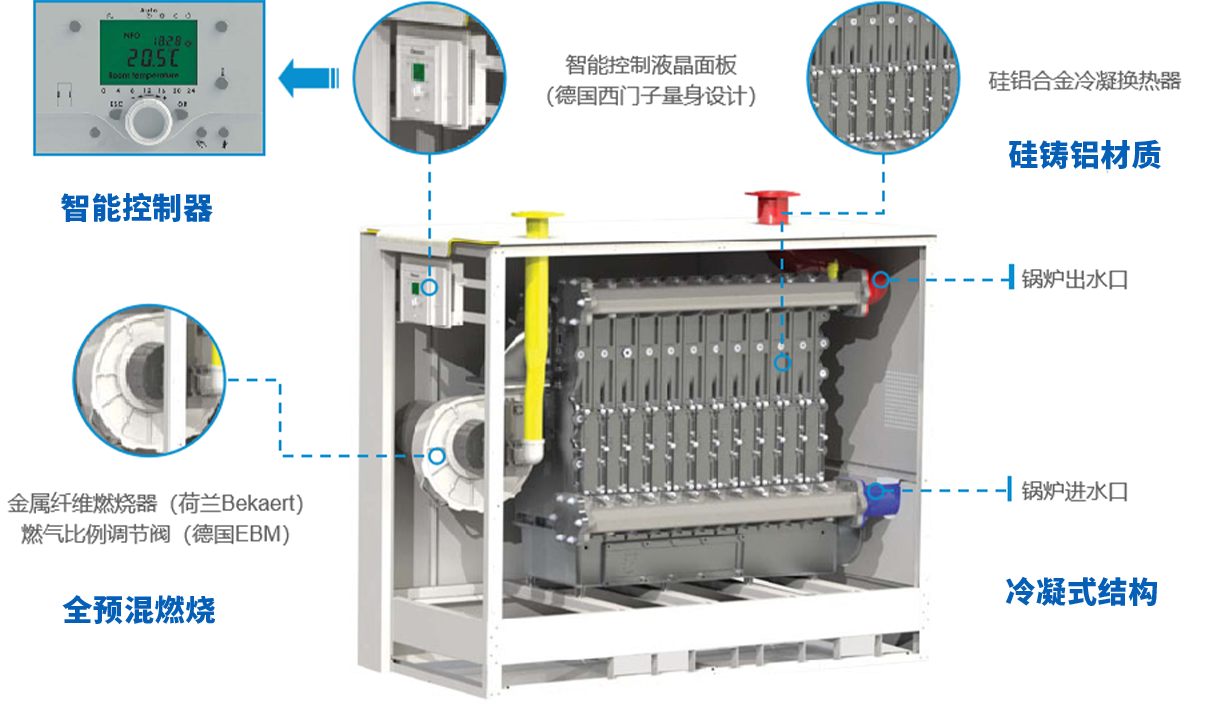 歐洲整機(jī)原裝進(jìn)口,硅鋁合金換熱器,抗腐蝕性強(qiáng),壽命有保證,德國SIEMENS控制器,命令Ⅲ級輸出,檢測輸出信號,執(zhí)行過程更有11重安全保護(hù),確保燃燒工況,安全無隱患,更有15~100%無極變頻調(diào)節(jié)功能,提高使用體驗(yàn)。