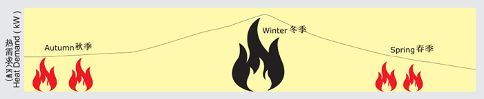 考慮到寒冷時供暖的要求,安裝在建筑物內(nèi)的鍋爐功率取決于熱負(fù)荷。而只有在冬季有限的時間段供暖需求大,因此裝機功率對平常供暖需求綽綽有余,這使鍋爐跨季時的平均性能相當(dāng)差。如果用于提供生活熱水,性能將更差。改善性能的方法是使用模塊組合熱源,按系統(tǒng)要求有效地提供熱源。