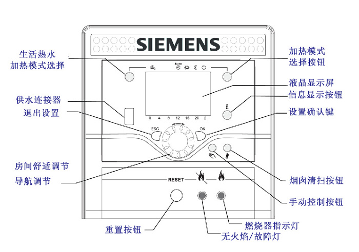 10.后循環(huán)保護(hù):燃燒器停止,屏幕上顯示水溫,如果需求溫度和調(diào)節(jié)溫度溫差超過25度,循環(huán)系統(tǒng)重新啟動。